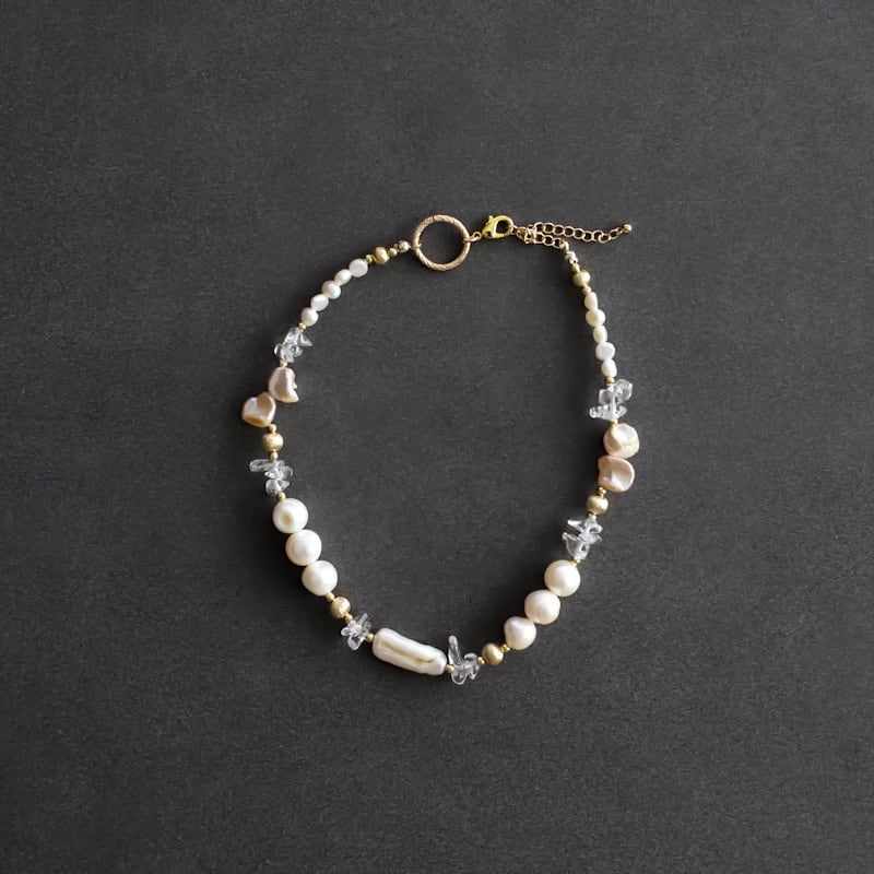パールや水晶はデリケートな素材です。強い力や衝撃を加えると破損する恐れがありますので、優しくお取り扱いください。
